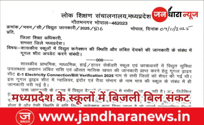 भोपाल। लोक शिक्षण संचालनालय, मध्यप्रदेश ने सभी जिलों के जिला शिक्षा अधिकारियों को पत्र जारी कर शासकीय स्कूलों और छात्रावासों में विद्युत कनेक्शन से संबंधित जानकारी तत्काल गूगल शीट पर अपडेट करने के निर्देश दिए हैं। संचालनालय द्वारा जारी पत्र क्रमांक भवन/सी/विद्युत जानकारी/2025/816, दिनांक 04 नवंबर 2025, में कहा गया है कि शासकीय प्राथमिक, माध्यमिक, हाई एवं हायर सेकेंडरी स्कूलों सहित छात्रावासों की विद्युत सुविधा, लंबित देयक राशि और औसत मासिक खपत की जानकारी के लिए E-1 Electricity Connection/Bill Verification 2025 नाम से गूगल शीट शेयर की गई थी। संचालक डी.एस. कुशवाह ने बताया कि अब तक केवल ग्वालियर, इंदौर और रीवा संभाग के कुछ स्कूलों की ही जानकारी भरी गई है। बाकी जिलों ने जानकारी अपडेट नहीं की है, जिससे विद्युत देयकों के भुगतान में बाधा आ रही है।