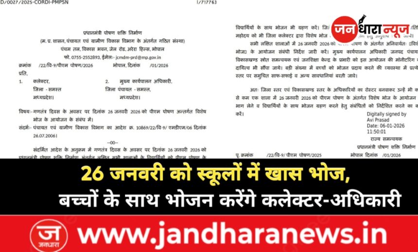 भोपाल। गणतंत्र दिवस के अवसर पर 26 जनवरी 2026 को मध्यप्रदेश की सभी लक्षित शालाओं में प्रधानमंत्री पोषण शक्ति निर्माण योजना के अंतर्गत विशेष भोज का आयोजन अनिवार्य रूप से किया जाएगा। इस संबंध में प्रधानमंत्री पोषण शक्ति निर्माण (पंचायत एवं ग्रामीण विकास विभाग) द्वारा समस्त जिला कलेक्टरों एवं जिला पंचायत के मुख्य कार्यपालन अधिकारियों को निर्देश जारी किए गए हैं।