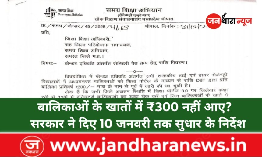 लोक शिक्षण संचालनालय, मध्यप्रदेश भोपाल ने सभी जिलों को निर्देश दिए हैं कि शिक्षा पोर्टल 3.0 पर कक्षा 7वीं से 12वीं तक पंजीकृत बालिकाओं के डाटा की अद्यतन जांच की जाए। जिन बालिकाओं के खातों में राशि अब तक नहीं पहुंची है, उनके प्रकरणों का निराकरण कर आवश्यक सुधार किया जाए।