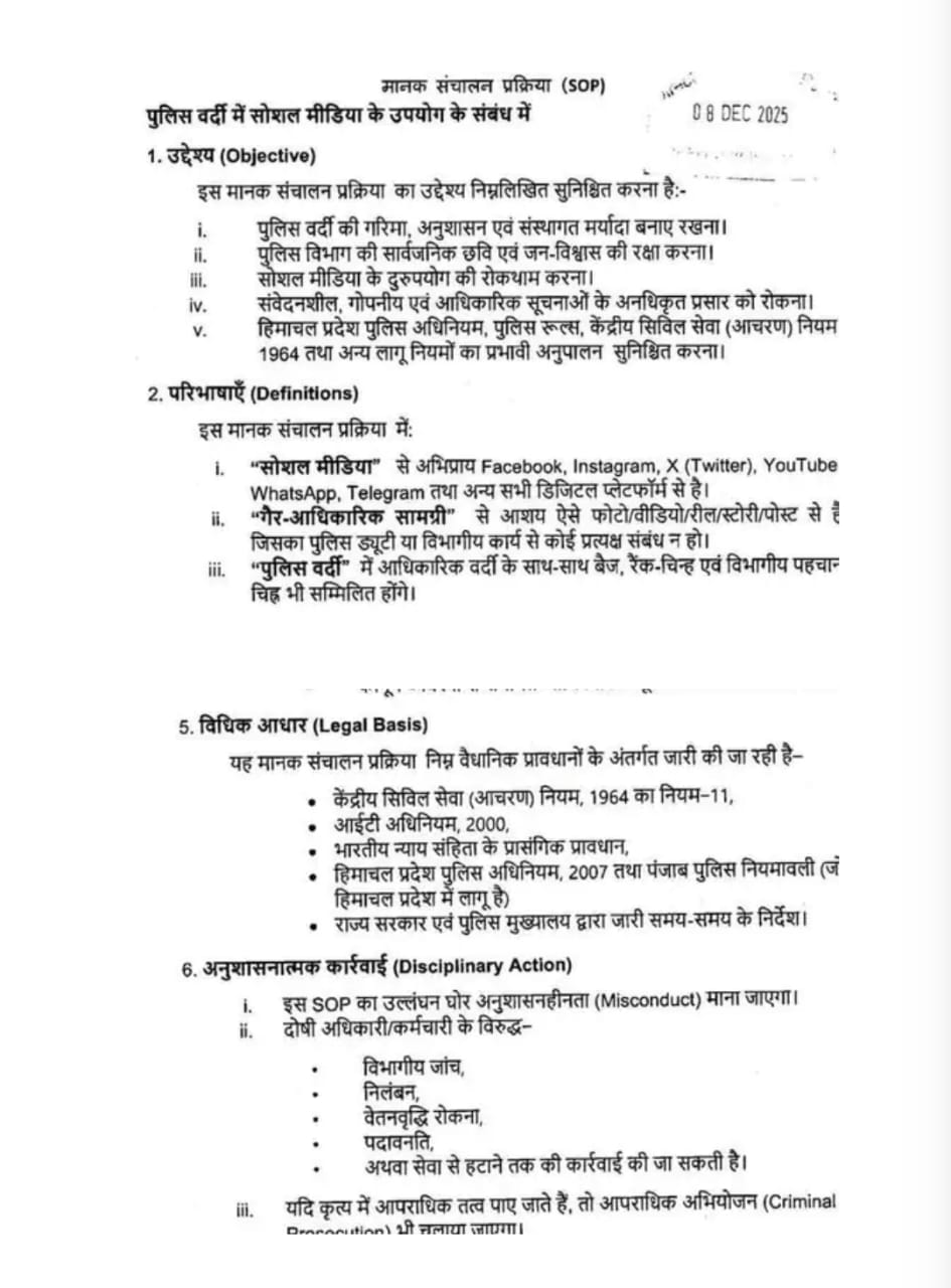 विभाग द्वारा जारी दिशा-निर्देश केंद्रीय सिविल सेवा (आचरण) नियम 1964 के नियम-11, आईटी अधिनियम 2000, भारतीय न्याय संहिता, हिमाचल प्रदेश पुलिस अधिनियम 2007 तथा लागू पुलिस नियमावली के आधार पर तैयार किए गए हैं। SOP के उल्लंघन को “घोर अनुशासनहीनता” की श्रेणी में रखते हुए विभाग ने स्पष्ट निर्देश दिए हैं कि दोषी पाए जाने पर संबंधित पुलिसकर्मियों के खिलाफ विभागीय जांच, निलंबन, वेतनवृद्धि रोकना, पदावनति या सेवा से पृथक करने जैसे कठोर दंड दिए जा सकते हैं। यदि कृत्य में आपराधिक तत्व पाए जाते हैं तो आपराधिक मुकदमा भी दर्ज किया जाएगा। पुलिस मुख्यालय ने सभी जिलों को SOP का पालन सुनिश्चित कराने के निर्देश दिए हैं और चेतावनी दी है कि वर्दी की गरिमा और विभाग की साख से समझौता बिल्कुल बर्दाश्त नहीं किया जाएगा।