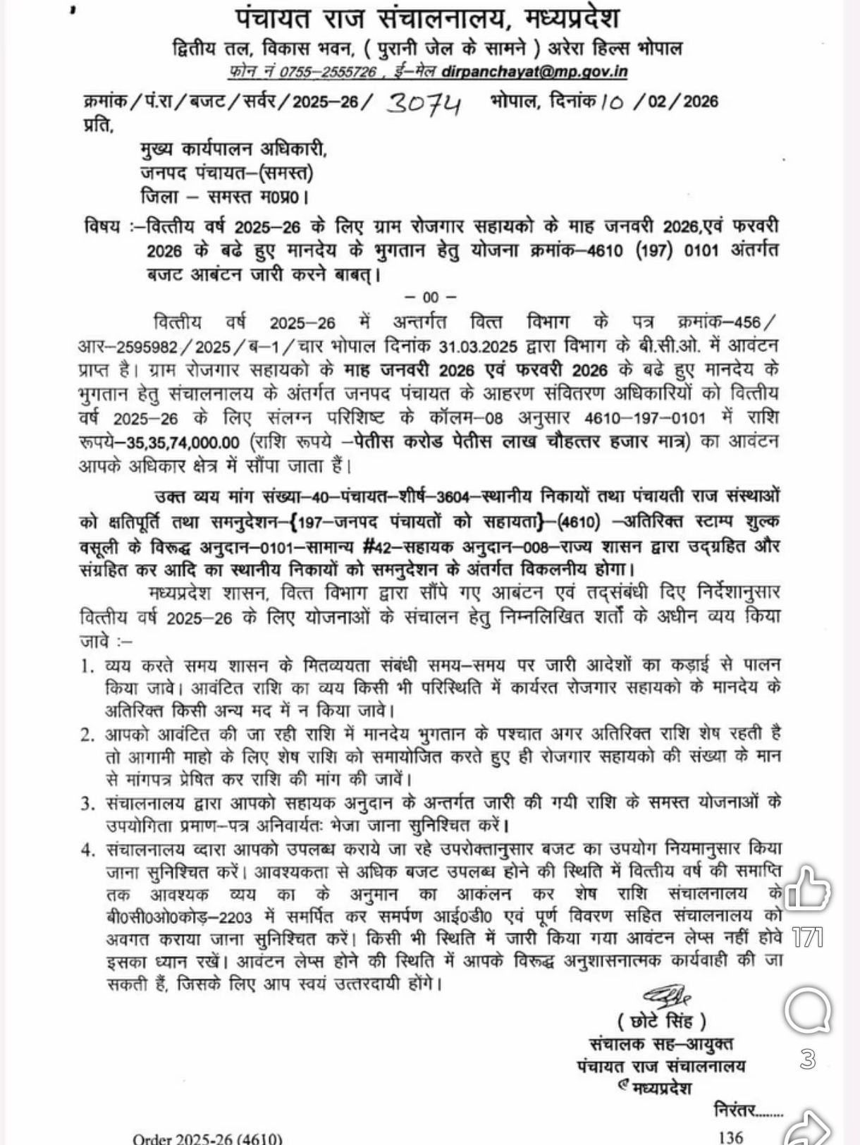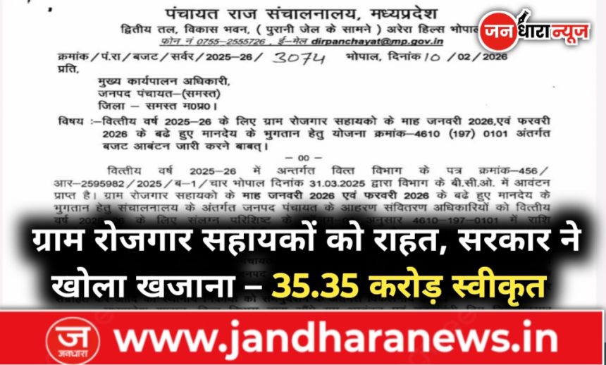 भोपाल। पंचायत राज संचालनालय, मध्यप्रदेश ने वित्तीय वर्ष 2025-26 के तहत ग्राम रोजगार सहायकों के बढ़े हुए मानदेय के भुगतान के लिए बजट आवंटन जारी किया है। यह आवंटन माह जनवरी 2026 एवं फरवरी 2026 के मानदेय भुगतान हेतु किया गया है।