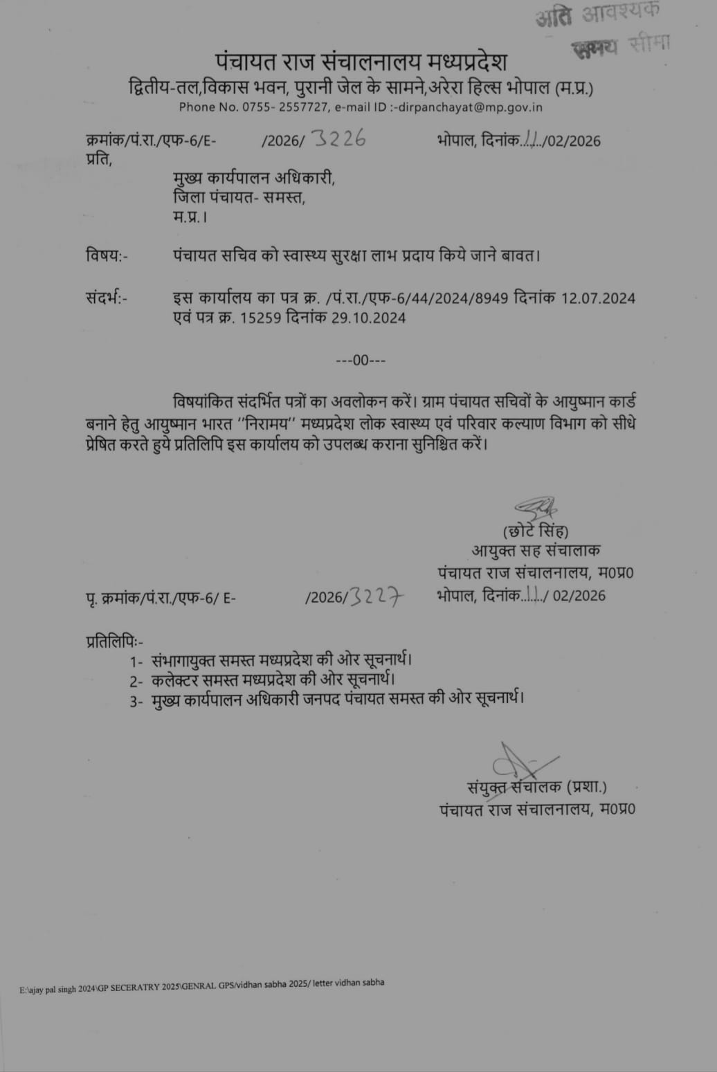 जारी पत्र में स्पष्ट किया गया है कि ग्राम पंचायत सचिवों के आयुष्मान कार्ड बनाए जाने हेतु आयुष्मान भारत “निरामय” योजना के अंतर्गत प्रस्ताव सीधे मध्यप्रदेश लोक स्वास्थ्य एवं परिवार कल्याण विभाग को प्रेषित किए जाएं। साथ ही, की गई कार्रवाई की प्रतिलिपि पंचायत राज संचालनालय को भी अनिवार्य रूप से उपलब्ध कराई जाए।