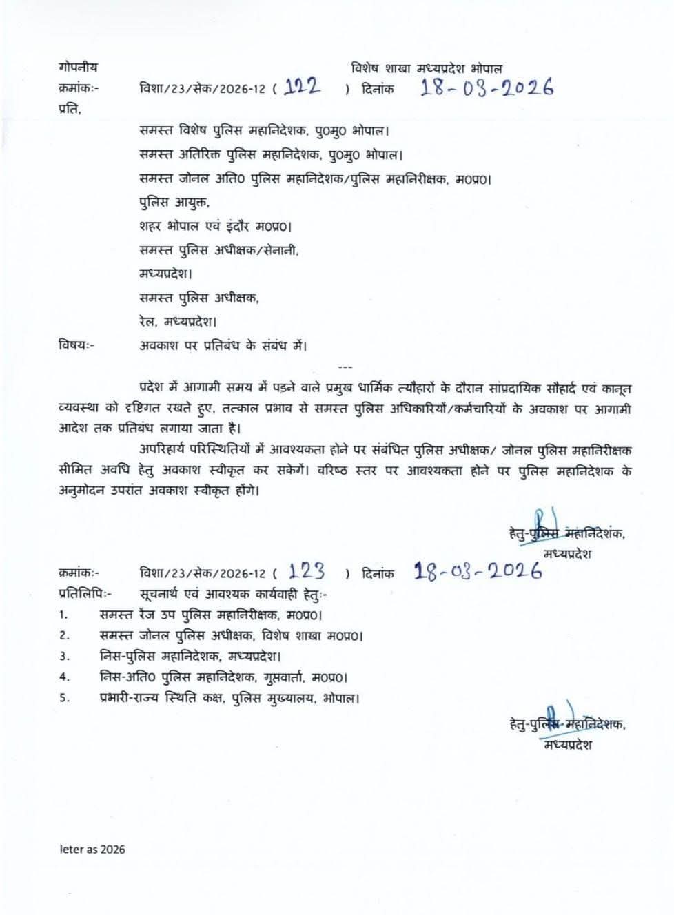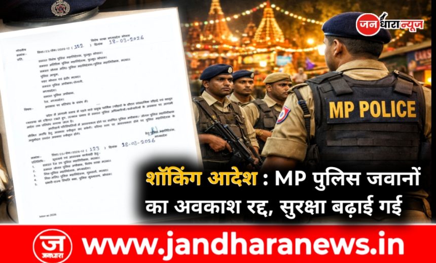 भोपाल। प्रदेश में आगामी प्रमुख धार्मिक त्योहारों के मद्देनजर मध्यप्रदेश पुलिस ने सभी अधिकारियों और कर्मचारियों के अवकाश पर तत्काल प्रभाव से प्रतिबंध लगा दिया है। यह आदेश विशेष शाखा, मध्यप्रदेश पुलिस मुख्यालय द्वारा जारी किया गया है।