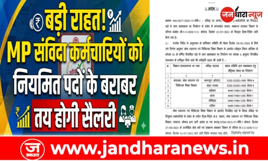 भोपाल । मध्यप्रदेश शासन के लोक स्वास्थ्य एवं चिकित्सा शिक्षा विभाग ने संविदा कर्मचारियों के हित में महत्वपूर्ण आदेश जारी किया है। इस आदेश के तहत विभाग में कार्यरत संविदा अधिकारियों एवं कर्मचारियों के पदों की समकक्षता नियमित पदों के साथ निर्धारित कर उन्हें उसी आधार पर वेतनमान देने की स्वीकृति प्रदान की गई है।