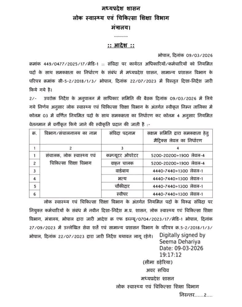 जारी आदेश के अनुसार सामान्य प्रशासन विभाग के 22 जुलाई 2023 के परिपत्र के पालन में 9 मार्च 2026 को आयोजित साधिकार समिति की बैठक में यह निर्णय लिया गया। समिति ने विभाग के विभिन्न संविदा पदों के लिए मैट्रिक्स लेवल तय करते हुए उन्हें नियमित पदों के समकक्ष वर्गीकृत किया है।