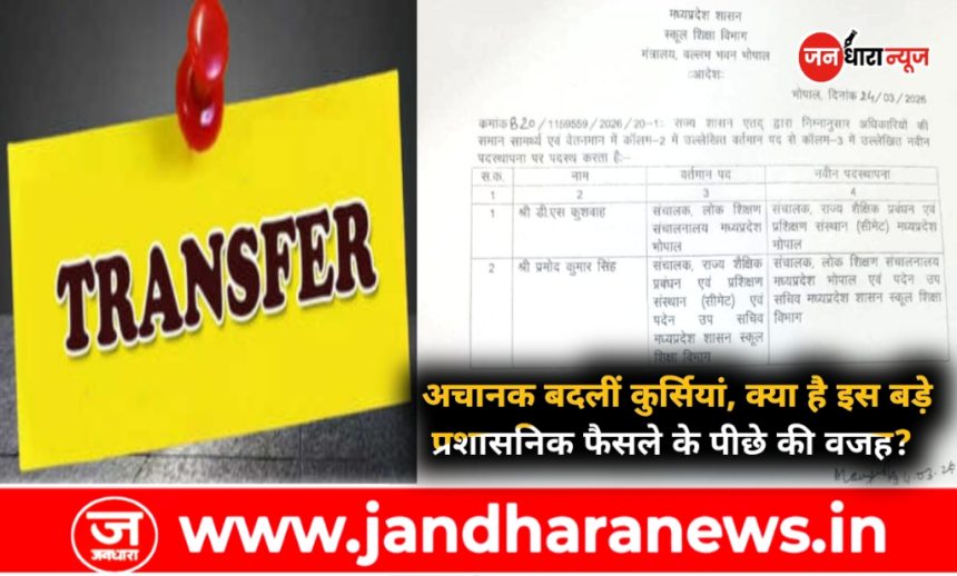 भोपाल। मध्यप्रदेश शासन के स्कूल शिक्षा विभाग ने प्रशासनिक व्यवस्था में बदलाव करते हुए दो वरिष्ठ अधिकारियों के पदस्थापन आदेश जारी किए हैं। मंत्रालय वल्लभ भवन से जारी आदेश के अनुसार यह बदलाव तत्काल प्रभाव से लागू कर दिया गया है।