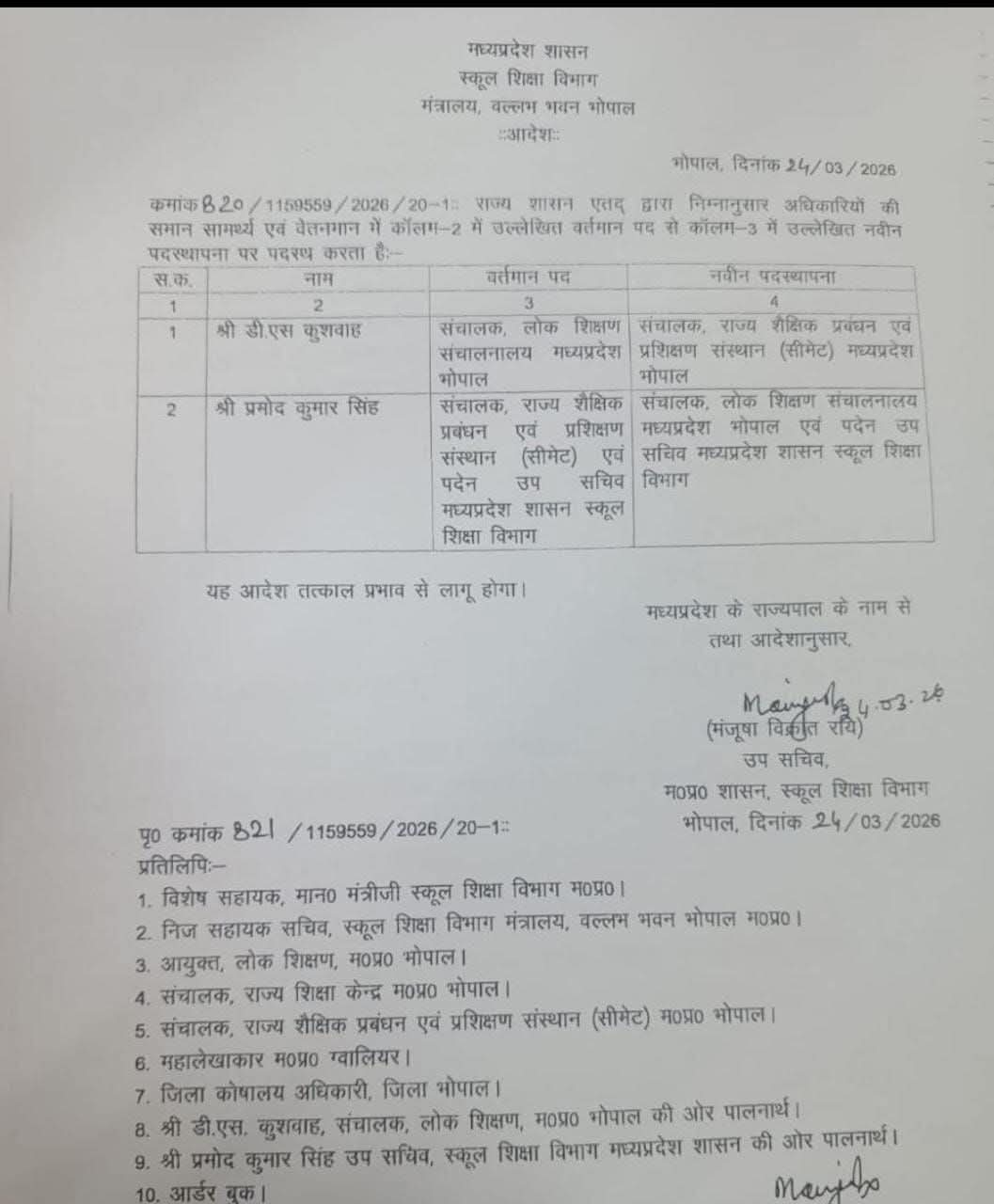 विभाग द्वारा जारी में उल्लेख किया गया है कि डी.एस. कुशवाह को उनके वर्तमान पद संचालक, लोक शिक्षण संचालनालय, मध्यप्रदेश भोपाल से स्थानांतरित कर संचालक, राज्य शैक्षिक प्रबंधन एवं प्रशिक्षण संस्थान (सीमेट), भोपाल पद पर पदस्थ किया गया है।