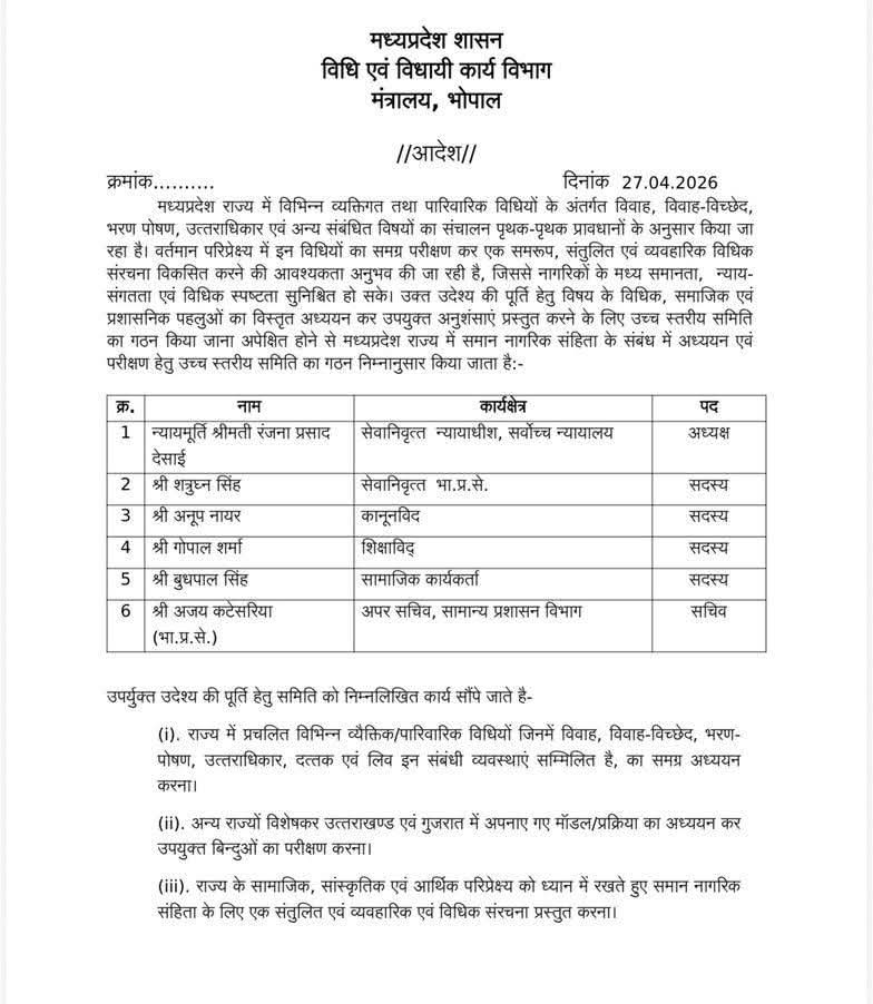 समिति को राज्य में प्रचलित सभी व्यक्तिगत एवं पारिवारिक विधियों का व्यापक अध्ययन करने, अन्य राज्यों विशेषकर उत्तराखण्ड एवं गुजरात में अपनाए गए मॉडल का विश्लेषण करने तथा मध्यप्रदेश की सामाजिक, सांस्कृतिक एवं आर्थिक परिस्थितियों को ध्यान में रखते हुए एक व्यवहारिक समान नागरिक संहिता का प्रारूप तैयार करने के निर्देश दिए गए हैं। सरकार की इस पहल को राज्य में एक समान कानून व्यवस्था की दिशा में महत्वपूर्ण कदम माना जा रहा है। देखें पत्र…