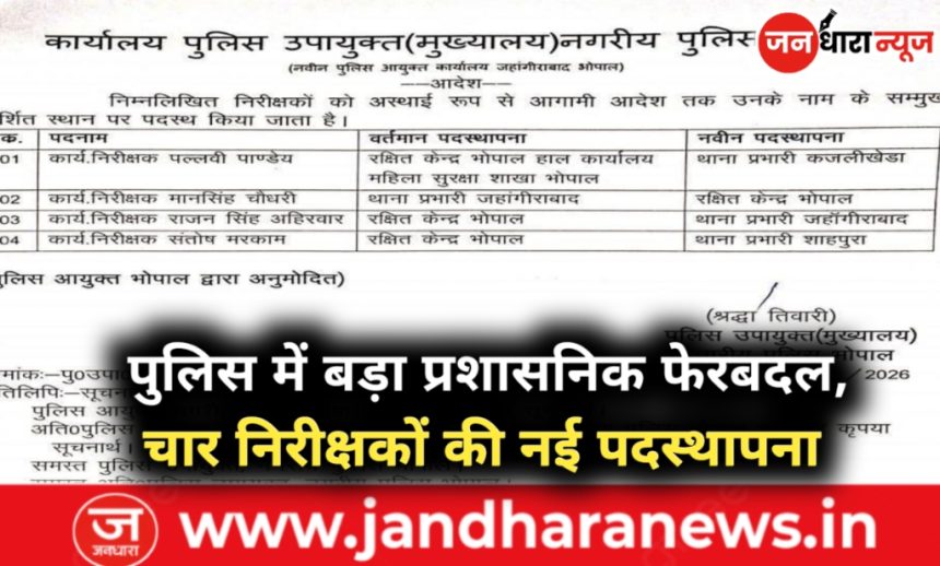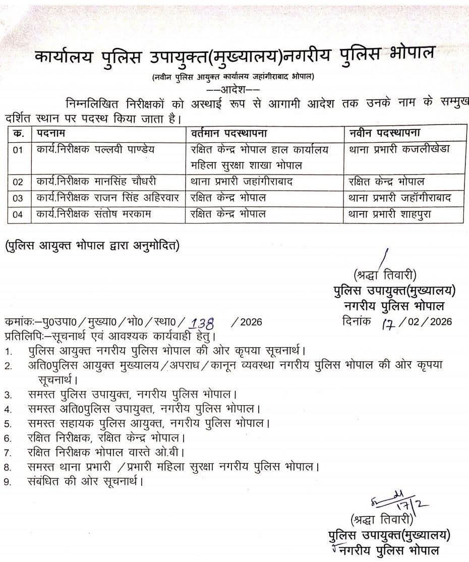 भोपाल। नगरीय पुलिस भोपाल में प्रशासनिक व्यवस्था को सुदृढ़ करने के उद्देश्य से चार निरीक्षकों के तबादले किए गए हैं। पुलिस उपायुक्त (मुख्यालय) श्रद्धा तिवारी द्वारा जारी आदेश के अनुसार यह पदस्थापनाएँ अस्थायी रूप से आगामी आदेश तक प्रभावशील रहेंगी। उक्त आदेश को पुलिस आयुक्त भोपाल द्वारा अनुमोदित किया गया है।