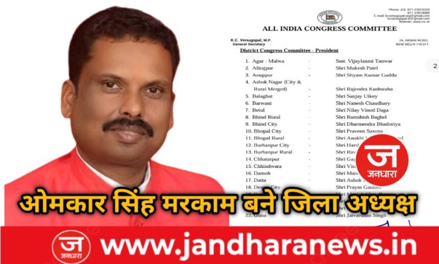 अखिल भारतीय कांग्रेस कमेटी (AICC) ने संगठन सृजन अभियान के तहत मध्यप्रदेश के विभिन्न जिलों में नए जिला कांग्रेस कमेटी अध्यक्षों की नियुक्ति की है। कांग्रेस अध्यक्ष द्वारा अनुमोदित इन नियुक्तियों की घोषणा एआईसीसी महासचिव व सांसद के.सी. वेणुगोपाल ने की। जारी सूची में डिंडौरी जिले से ओमकार सिंह मरकाम को जिला कांग्रेस कमेटी अध्यक्ष नियुक्त किया गया है। उनके चयन को लेकर जिलेभर के कांग्रेस कार्यकर्ताओं में उत्साह का माहौल है।
