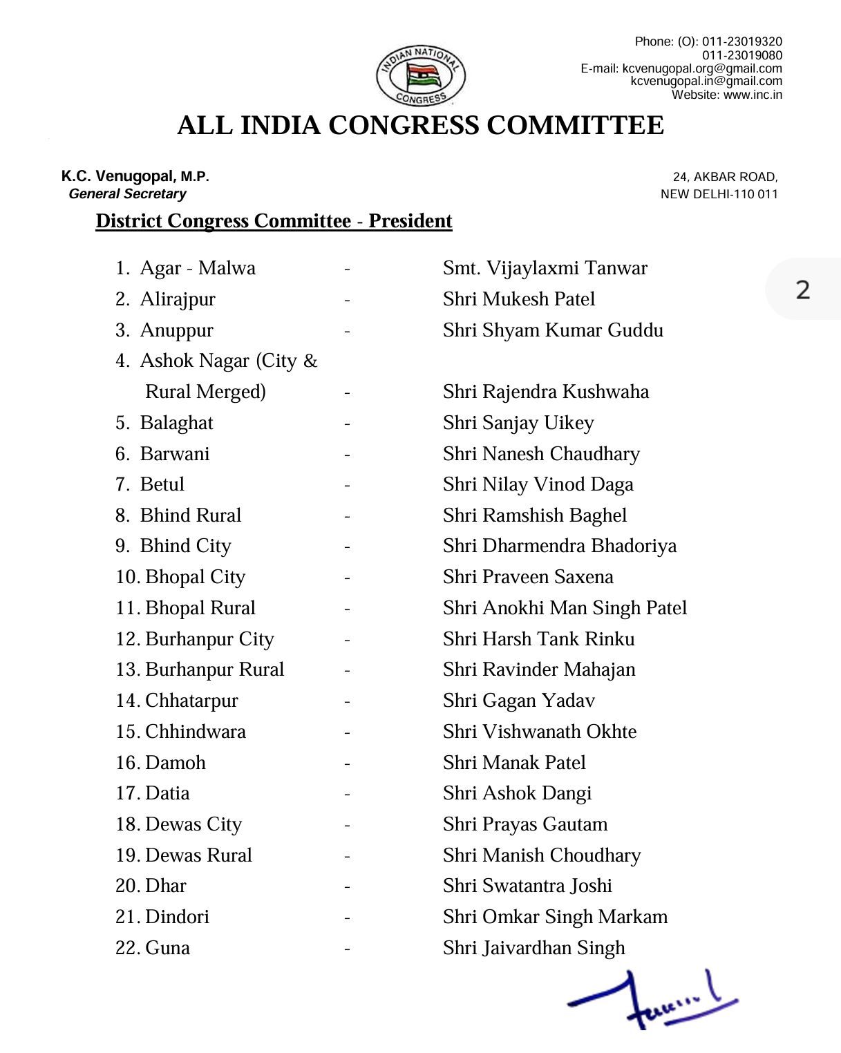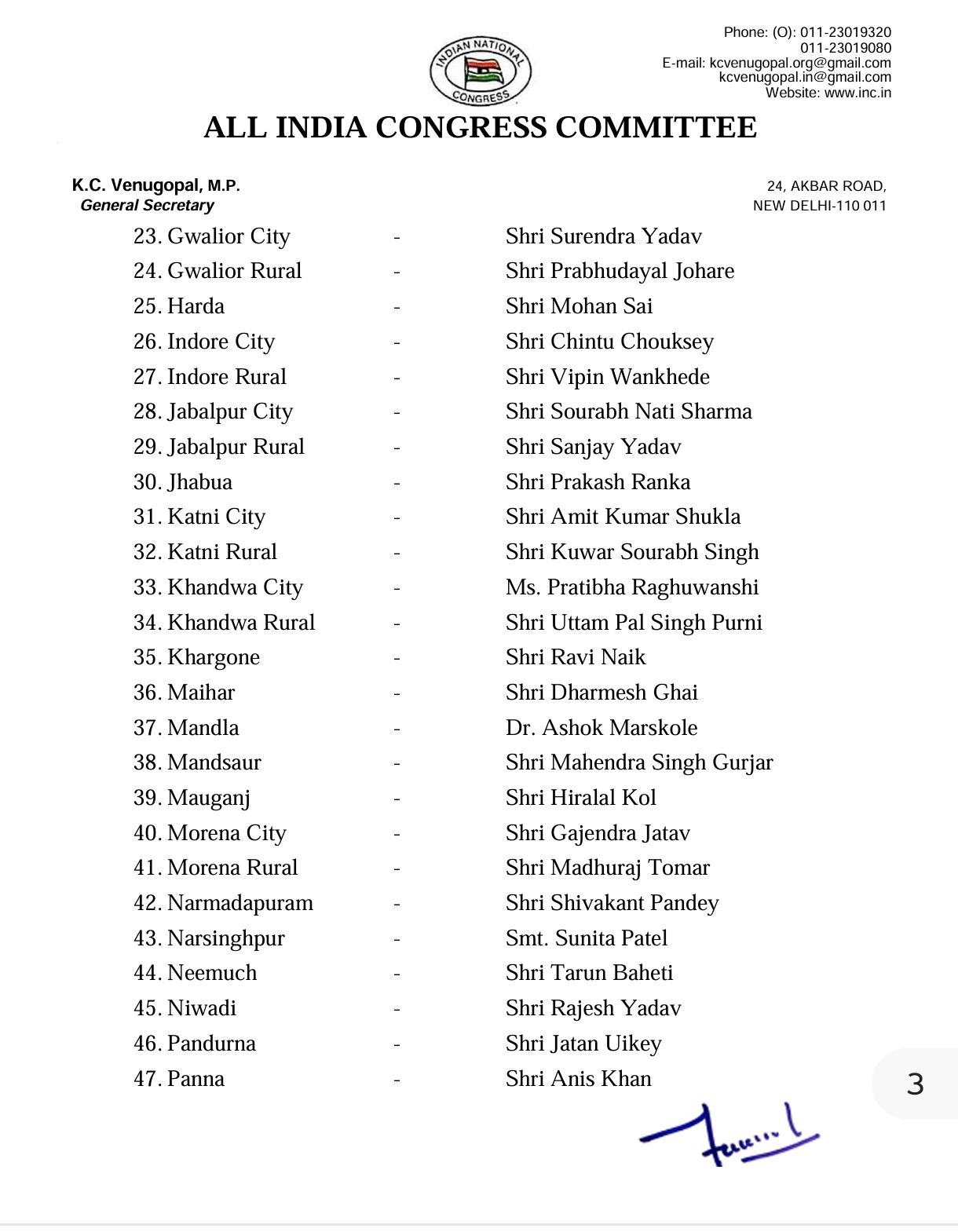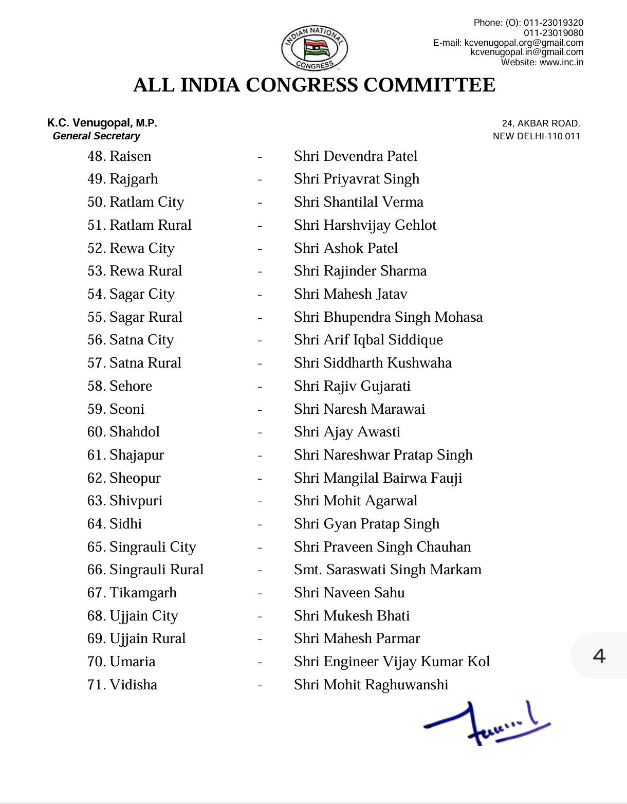 — नए जिला कांग्रेस कमेटी अध्यक्षों की सूची