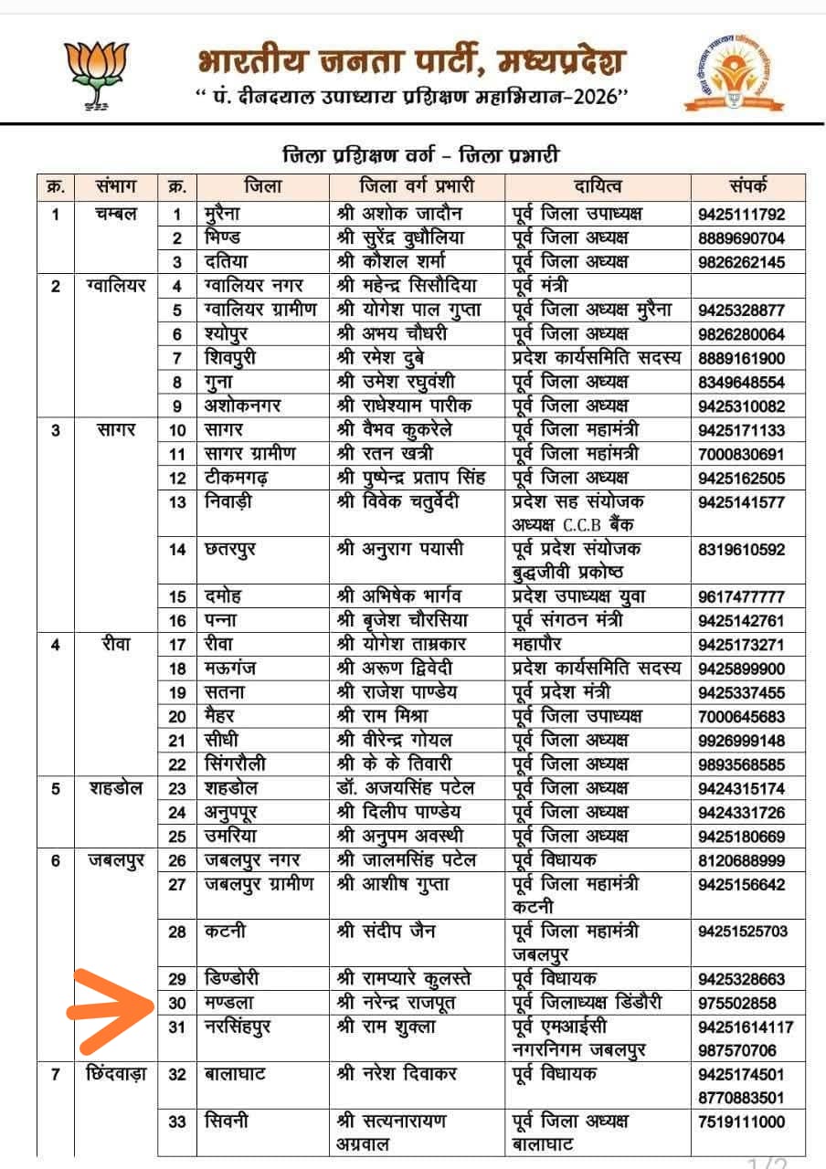 डिंडौरी/मंडला। भारतीय जनता पार्टी द्वारा पं. दीनदयाल उपाध्याय प्रशिक्षण महाअभियान-2026 के तहत जिला प्रशिक्षण वर्ग प्रभारियों की आधिकारिक सूची (पत्र) जारी कर दी गई है।