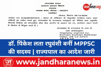 Mp News : राज्यपाल ने किया आदेश जारी, डॉ. पिंकेश लता रघुवंशी एमपी लोक सेवा आयोग की सदस्य नियुक्त….