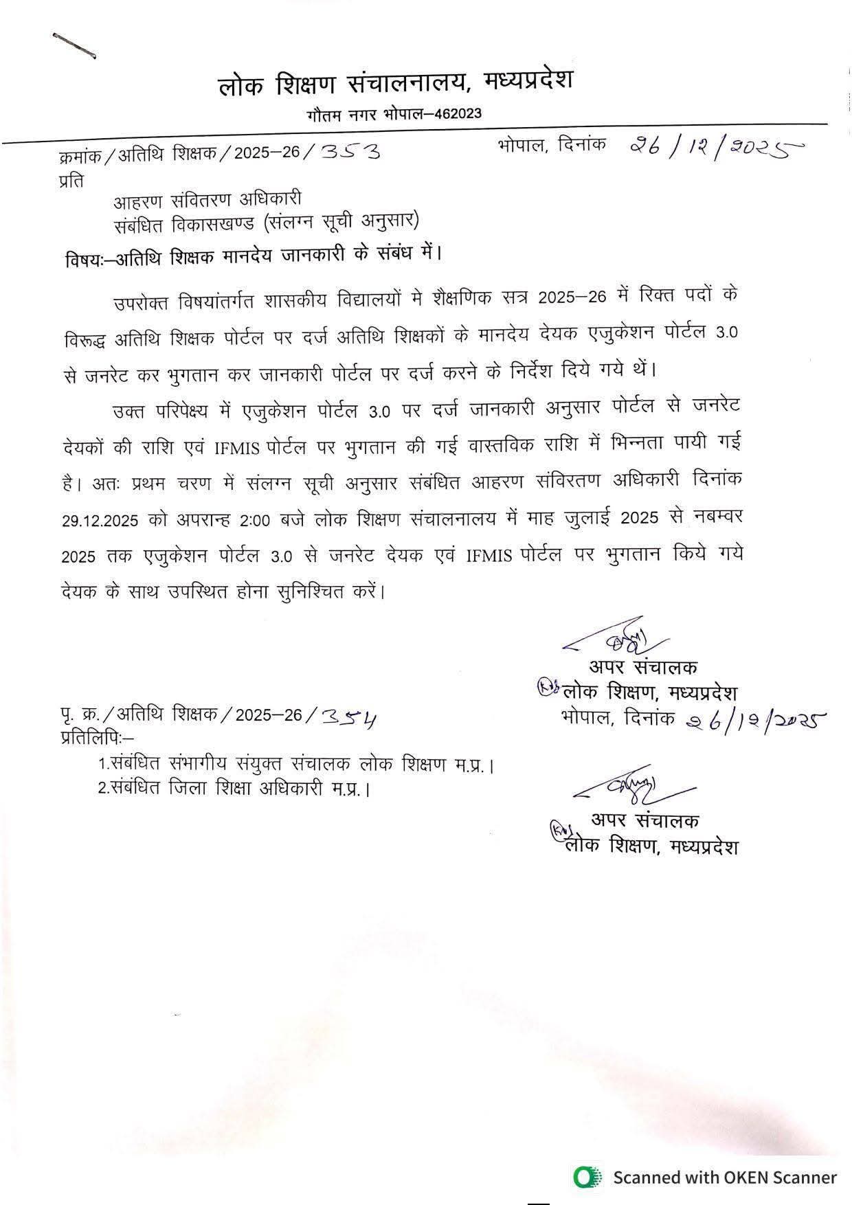 इसी परिप्रेक्ष्य में प्रथम चरण में संलग्न सूची के अनुसार संबंधित विकासखंडों के आहरण एवं संवितरण अधिकारियों को दिनांक 29 दिसंबर 2025 को अपरान्ह 2:00 बजे लोक शिक्षण संचालनालय, गौतम नगर भोपाल में उपस्थित होने के निर्देश दिए गए हैं। अधिकारियों को जुलाई 2025 से नवंबर 2025 तक की अवधि के एजुकेशन पोर्टल 3.0 से जनरेट देयक एवं IFMIS पोर्टल पर भुगतान किए गए देयकों के साथ उपस्थित होना अनिवार्य किया गया है। वहीं इस आदेश की प्रतिलिपि संबंधित संभागीय संयुक्त संचालक लोक शिक्षण एवं जिला शिक्षा अधिकारियों को भी भेजी गई है। संचालनालय ने स्पष्ट किया है कि मानदेय भुगतान में पारदर्शिता और त्रुटियों के निराकरण हेतु यह कार्रवाई की जा रही है। सूत्रों के अनुसार, यदि जांच में लापरवाही या अनियमितता सामने आती है तो संबंधित अधिकारियों पर आगे की कार्रवाई भी की जा सकती है।