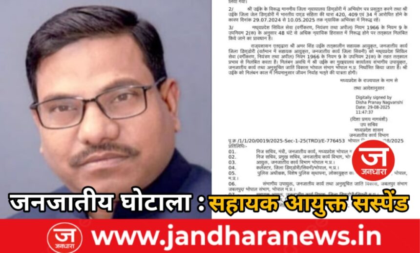 भोपाल। मध्यप्रदेश शासन जनजातीय कार्य विभाग ने डिंडौरी जिले में पदस्थापना के दौरान हुई वित्तीय अनियमितताओं के गंभीर आरोपों पर सहायक आयुक्त अमर सिंह उईके को निलंबित कर दिया है।